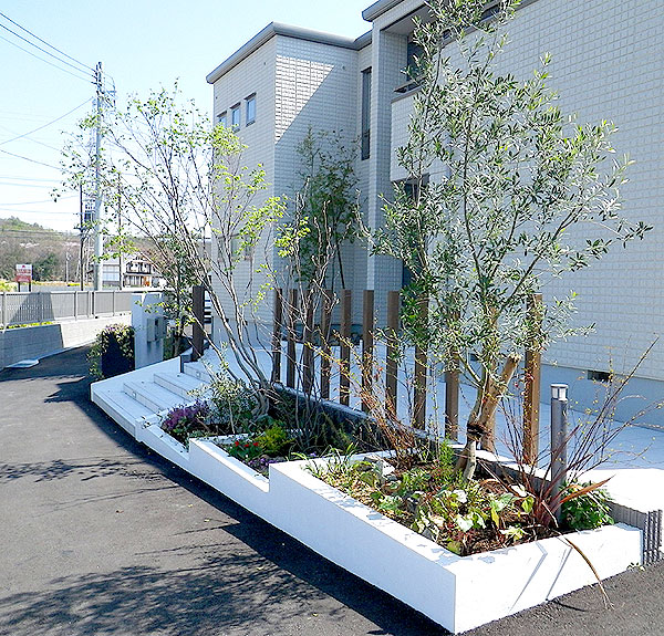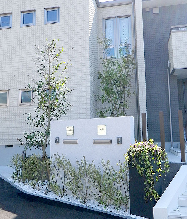 門柱の横に鉢植えをおきアクセントに。オリーブ、コハウチワカエデ等雑木で柔らかさを。