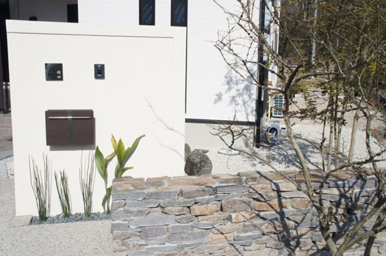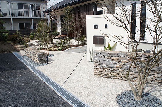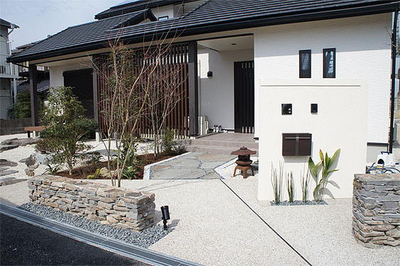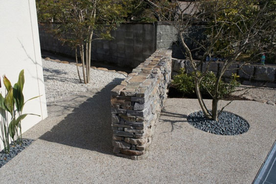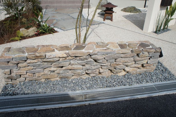 ヴィラストーンの小端積みと鉄平石の乱張り仕上げで和風モダンテイストにしました。