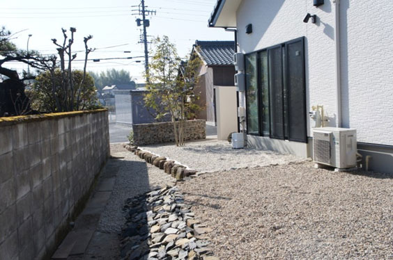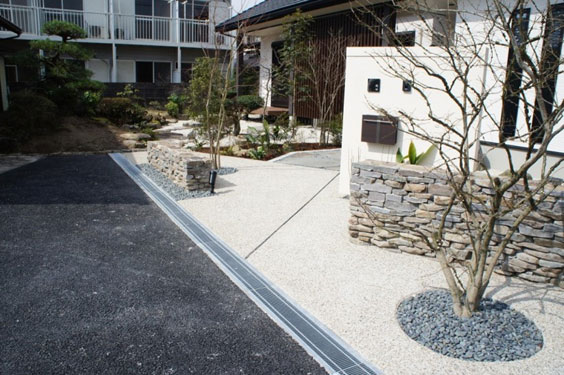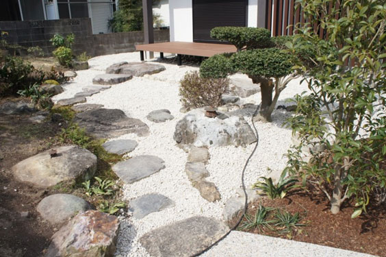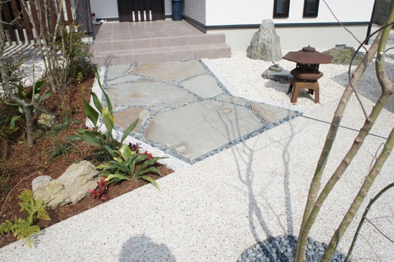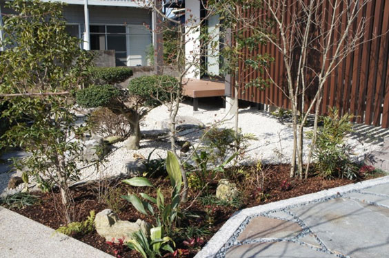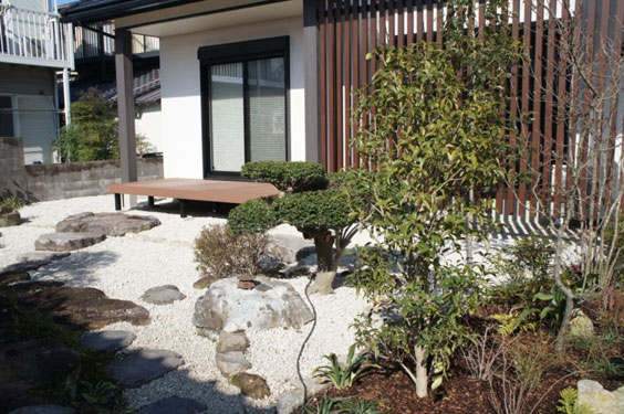 施工箇所 : 石庭工事、植栽工事、門柱工事、アプローチ工事、ウッドデッキ工事