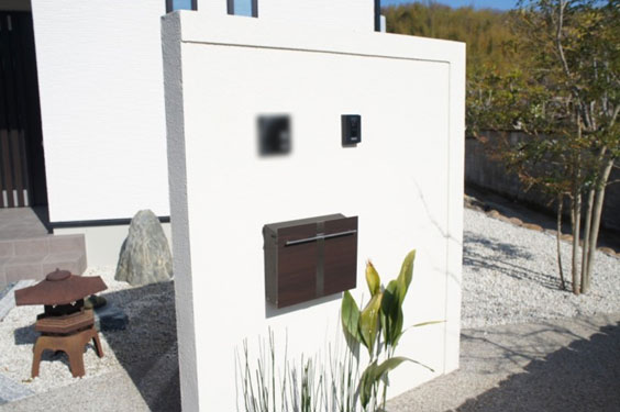 門柱はジョリパット仕上げとして、その周辺にヴィラストーンモカの小端積みを施しました。