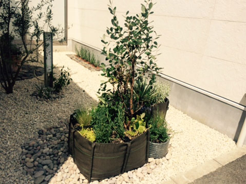 フランス発のプランターバックサックを用いて、中木・地被などを 植栽しました。 奥は、シンボルツリーとしてオリーブを植栽し、周りは割栗石を あしらいました。
