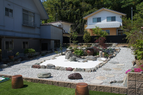 新たな石をたくさん使ったお庭にしたい、土の流出を防ぎたいとの要望をいただきました。