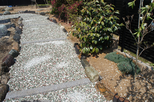 傾斜のあるお庭の為、クワンストーン延石で土の流出も防ぐよう施工しました。