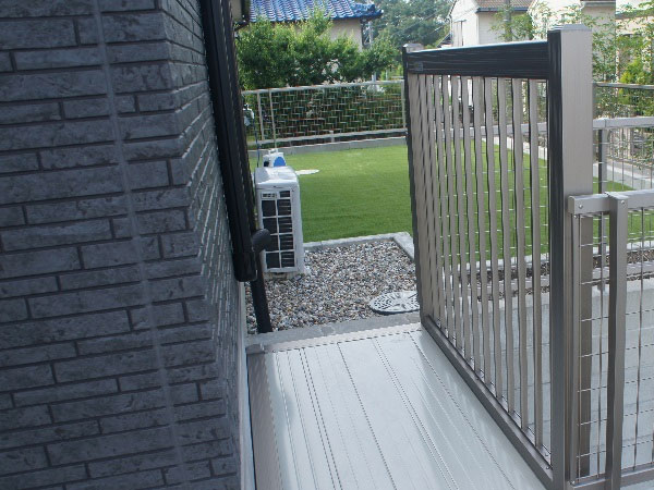 玄関からお庭へのアプローチにはフェンスと併せてベランダも設置。