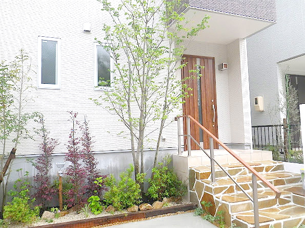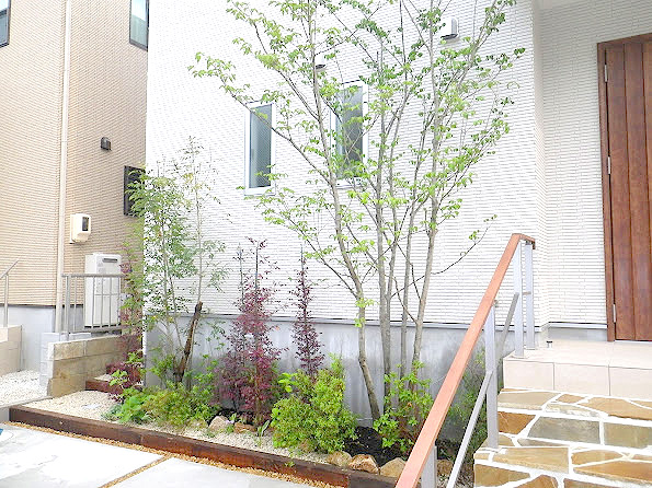 階段横にヤマボウシとオリーブ、シマトネリコを用いて、自然味あふれる庭としました。
